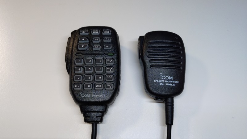こちらの写真の左側が今回購入したIC-2730Bに付属のマイクロホンになります。ここからも音量や周波数などの操作が出来るようになっていますので、ハンディトランシーバー用として購入したスピーカーマイクロホン(写真右側)に比べると1.5倍くらいの大きさがあります。