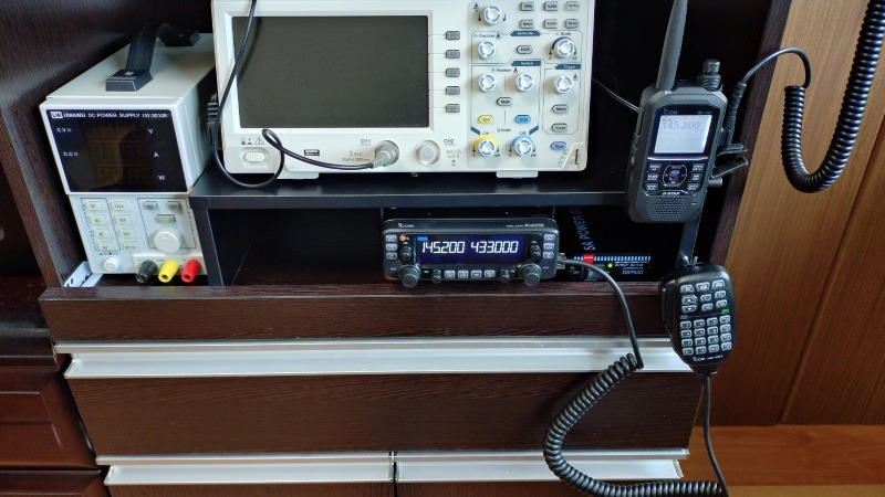 無線機を取り付けた台を元の場所に戻した状態がこちらの写真になります。オシロスコープを使用する時も邪魔になりませんし、高さ的にも丁度良い感じです。