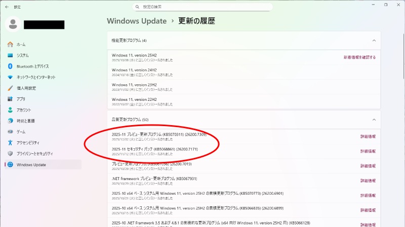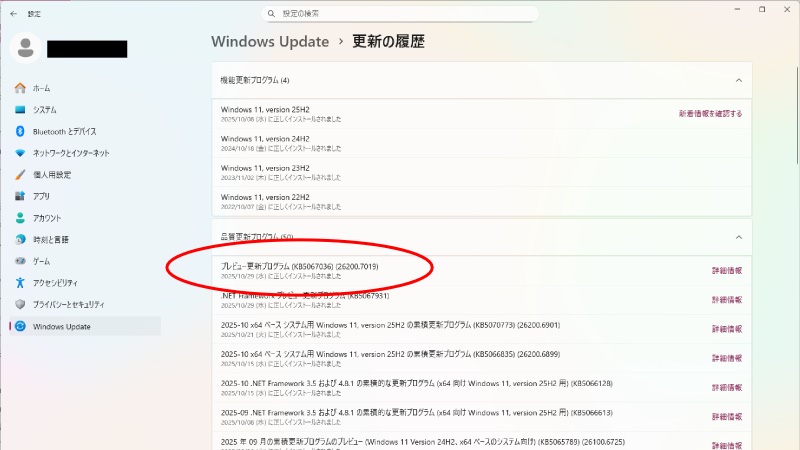 • まずは10月29日のプレビュー更新プログラム(KB5067036)がインストールされていることを確認します。(まだの場合はWindows Updateを実行してインストールしましょう。)