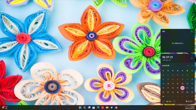 こちらの画像は11月20日のものになります。残念ながらまだスタートメニューには変化がないものの、気付いたらサブディスプレイ側でも通知センター機能が使用出来るようになっていました。日付の部分をクリックすると、ご覧のように通知やカレンダーが表示されます。