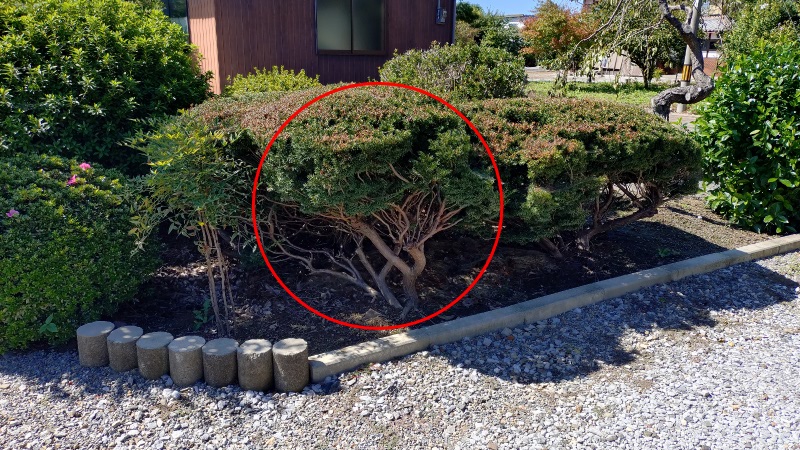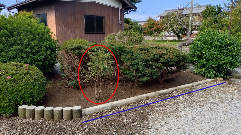 妻からは見た目も悪く、このイチイの木がない方がスッキリして良いのではとの意見もあったのですが、どの木もかなり成長しており全てを撤去となると大変な作業になりますし、これまで育ててきたのに可愛そうな思いもありますので、とりあえず最も手前にある赤い丸印の木だけを撤去してみることになりました。