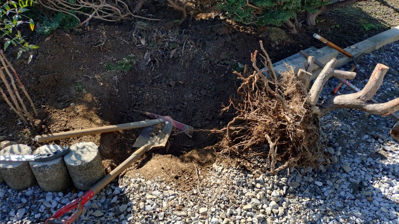 土を掘りながら根が見つかれば切断という作業をひたすら繰り返し、抜根作業を始めて90~100分が経過したところでようやく引き抜くことが出来ました。
