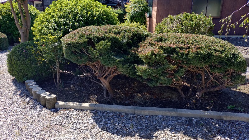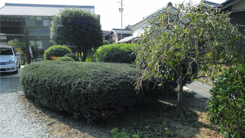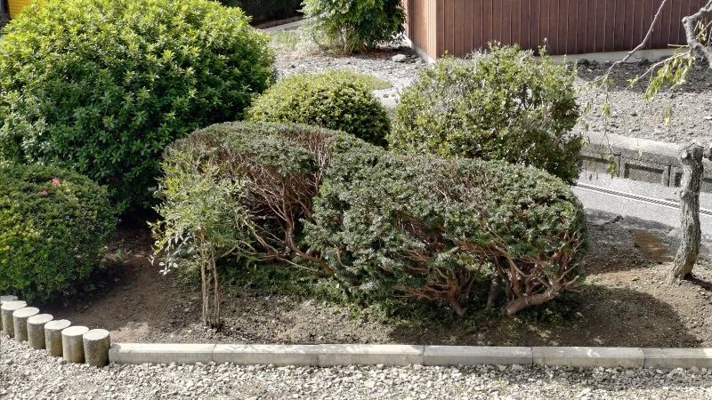 しかしながら、この横を通って車の出入りをしているため、車庫入れ時に側面が接触しないように注意が必要になるのと、特に積雪時季には通路の確保も難しくなるため、通路側に丸く張り出していた部分を刈り込んだのがこちらの写真になります。