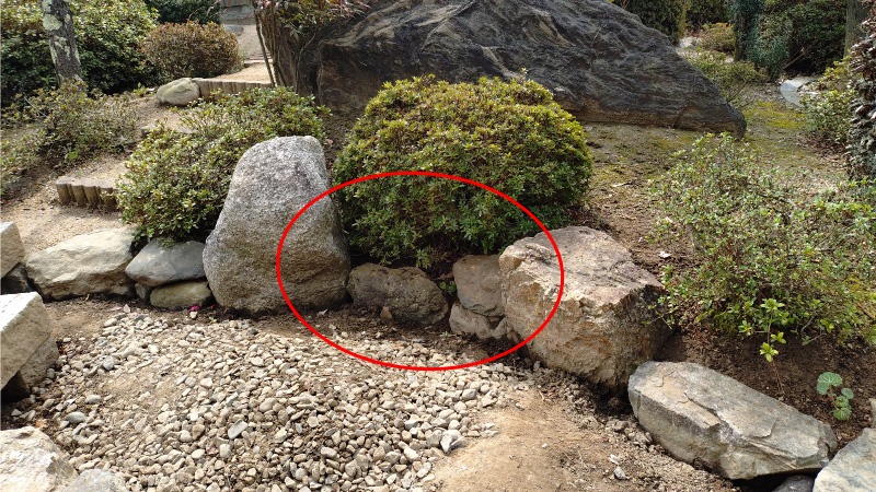これまでの作業でこちらの写真の赤い丸印のところ以外の場所は石を並べ終えていますので、最後に余った石を適当に組み合わせて両側の大きな石の間を埋めてやります。