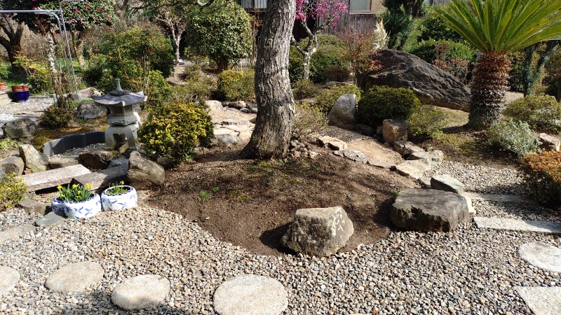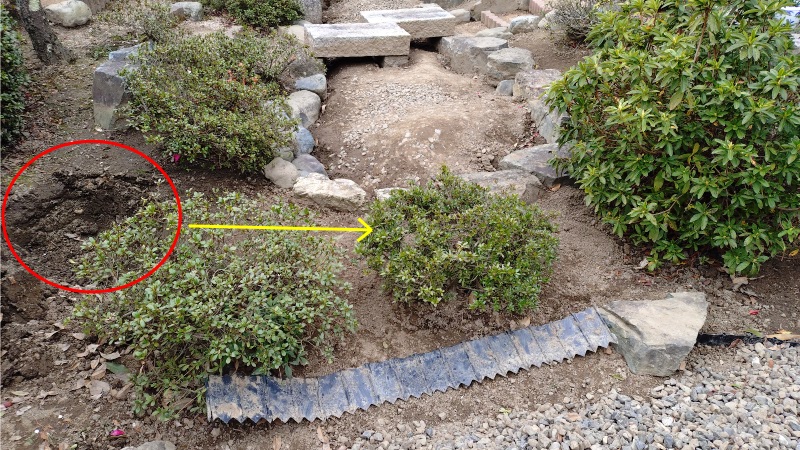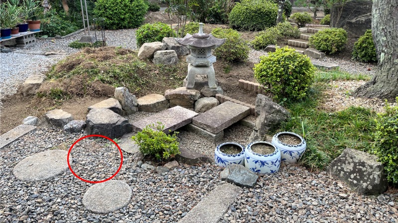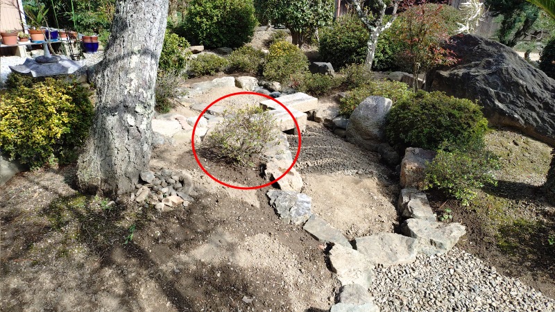 最後の作業は飛び石の追加になります。この写真は一昨年の秋にタマリュウの撤去作業をした時に撮影したものですが、この赤い丸印のあたりに飛び石を追加することにしました。