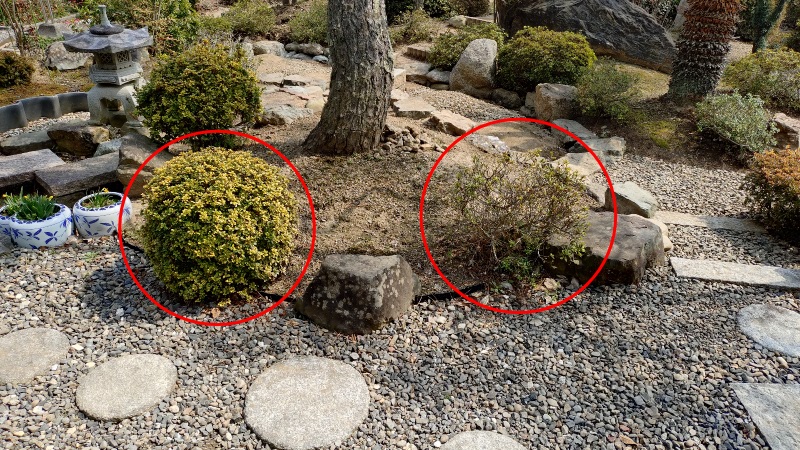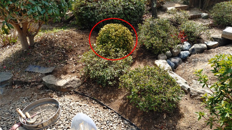 先ほどの移植作業に合わせて、こちらの写真の赤い丸印のところに植えてあったサツキも別の場所に移植することにしました。