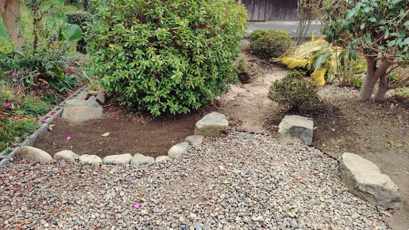 ここは並べた石のすぐ後ろ側にサツキを植えているため、枝が下方向に伸びてくれば石はほとんど見えなくなると思いますので、何となく並んでいれば問題なしとしました。