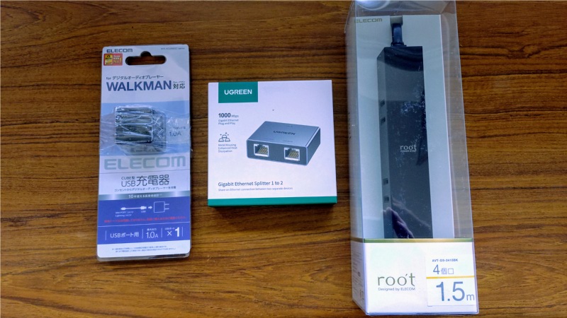 このLAN分配器に電源用のUSBケーブルは付属していましたが、ACアダプターは含まれていませんので、エレコムの小型のUSB充電器を合わせて購入しました。最近ではあまり見掛けることがなくなった5ボルト、1アンペア仕様の製品です。Amazonで583円でした。