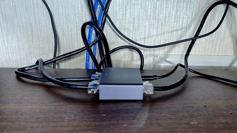 こちらの写真がオーディオラックの中にLAN分配器を設置した状況です。UGREENは中国の製品ですがデザインもなかなかオシャレな感じです。分岐するためのLANケーブルはルーターを購入した時に付属していた未使用品を活用することにしました。