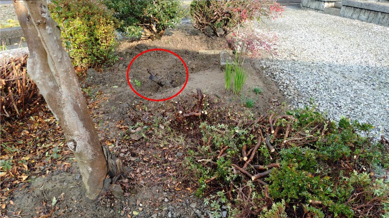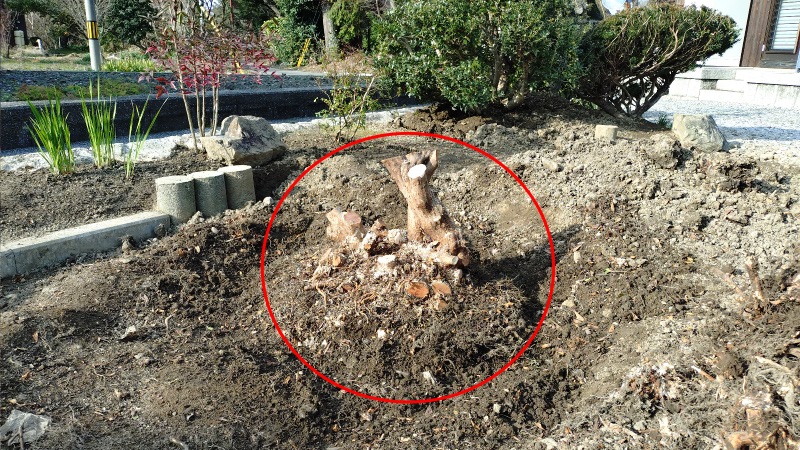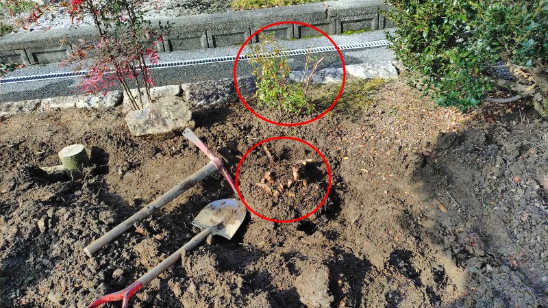 こちらの写真の手前の赤い丸印が伐根まで終えたサツキになります。根はそれなりに広範囲に伸びていたものの、思っていたほど深くはありませんでした。奥側の赤い丸印が一部を移植した状況になります。根の部分で切り分けることが出来たところだけ植え直しました。