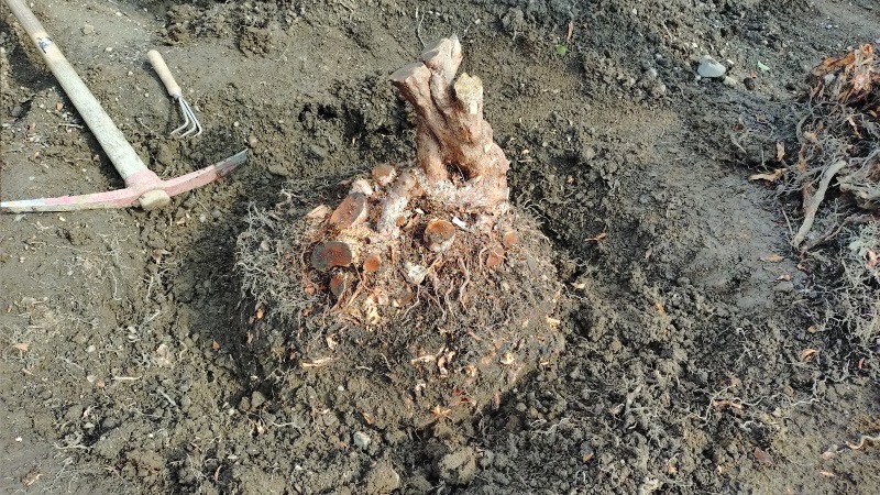 この写真は切り株の下に鶴嘴(つるはし)を入れて傾けた後、草取り用の鎌やバールなどを使って土や小石を取り除いているところになります。