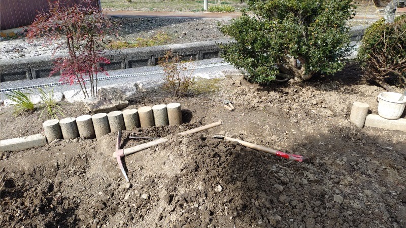 翌日の朝からは駐車スペースの拡幅作業を始める前から使用していたコンクリートのテストピースを使って縁石代わりに並べる作業に着手しました。