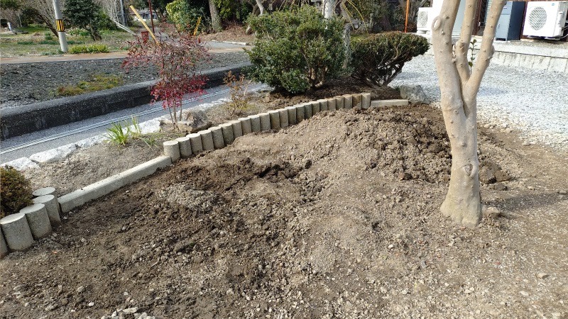 こちらは前回の作業終了時点での状況としてご紹介した写真になります。大きかったツツジの伐採を終えて、周囲に広がっていた根をある程度撤去したところで作業を中断していました。