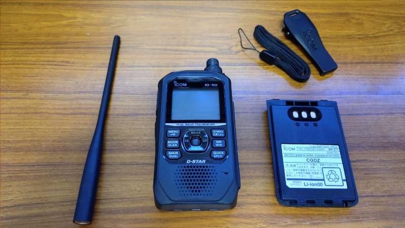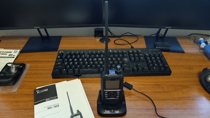 アイコム(ICOM)のID-50という製品で、同社のハンディトランシーバーの中では中間的な位置付けの製品です。2024年6月に発売開始になったもので、今回はYahoo!フリマに32,000円で出品されていたものを購入しました。オプション品の卓上急速充電器やキャリングケースが付属しての価格ですので、それなりに安く購入することが出来たのではないでしょうか。