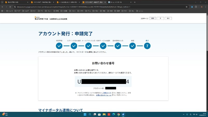 必要な情報の入力を終えたら、内容を良く確認して申請手続きは終了です。最後にマイナポータルとの連携が必要で、その時にこの画面のお問い合わせ番号の下に記載されたアカウントIDの入力が求められます。