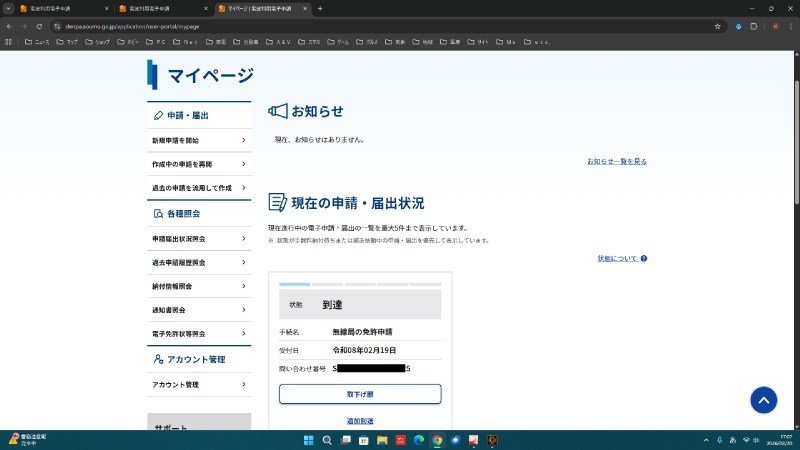 こちらは電波利用電子申請のマイページになります。現在の申請・届出状況の欄を見ると、無線局の免許申請が到達と表示されていますので、申請した内容が無事に届いているようです。