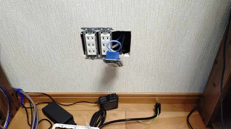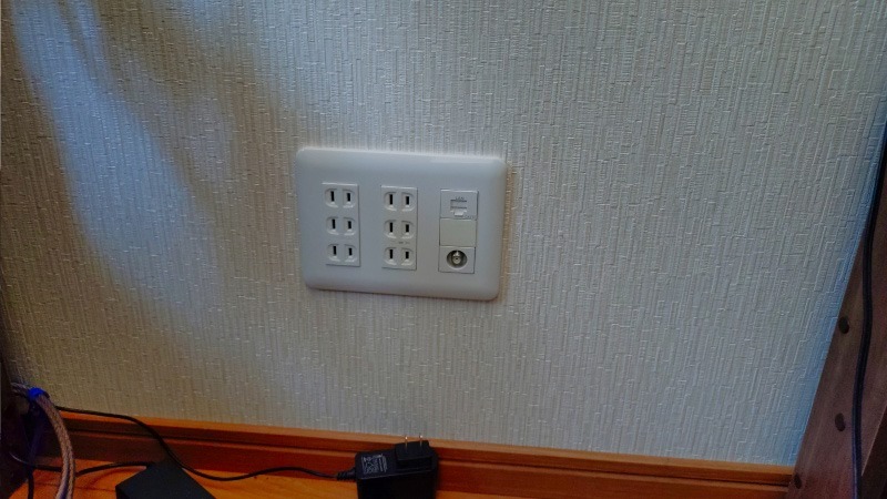 この写真はオーディオラックの裏の壁にあるコンセントです。ここにはLAN端子やテレビアンテナの端子がありますので、このLAN端子の下にあるブランクチップのところから同軸ケーブルを引き出せないかというのが一つ目の案になります。