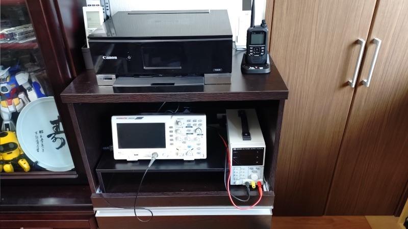 こちらはプリンターやオシロスコープなどを載せているラックになります。先日購入したハンディトランシーバーはとりあえずここに置いているのですが、元々は今月初めに固定電話の機種変更をするまでここに子機が置いてありました。