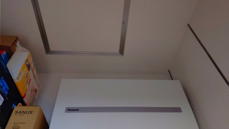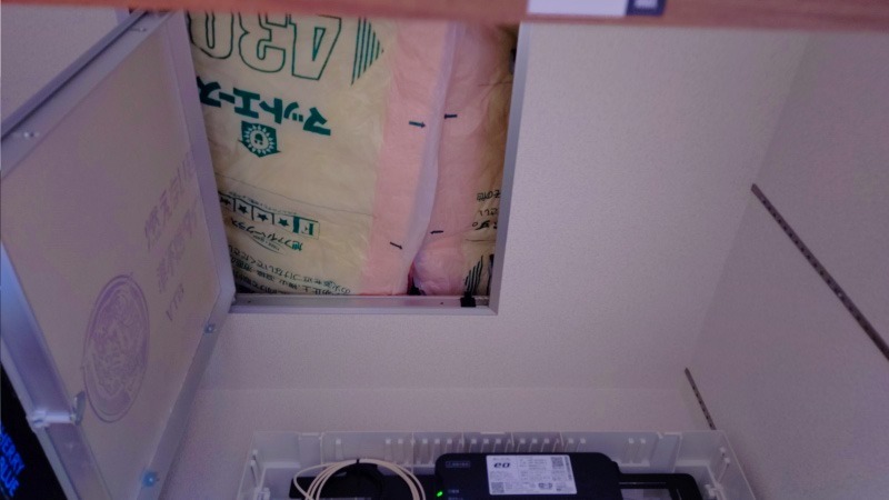 この天井には情報分電盤の作業用として点検口が設置されていますので、ここから中の様子を見てみることにしました。尚、リフォームの時に、使用する情報分電盤を選定する前に点検口の工事を先に済ませていたため、点検口と情報分電盤の位置が微妙に重なっていて、分電盤のカバーを外さないと点検口が開けられないという少し残念な設計になっています。