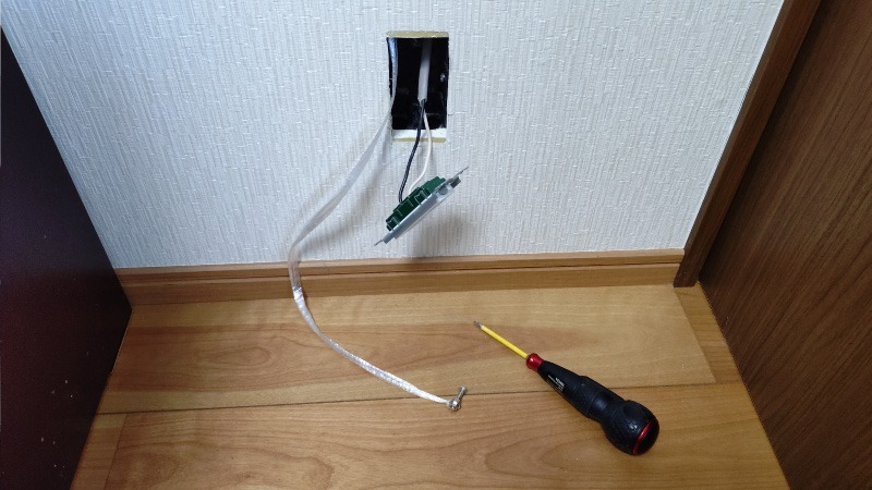 写真を見て頂ければ分かると思いますが、荷造り紐の先端にビスとナットを結び付けた状態でコンセントの穴からの回収に成功しましたので、これで同軸ケーブルが通せることは間違いないと思いますし、同軸ケーブルの引き込み時にこの荷造り紐が呼び線として活用出来ると思います。