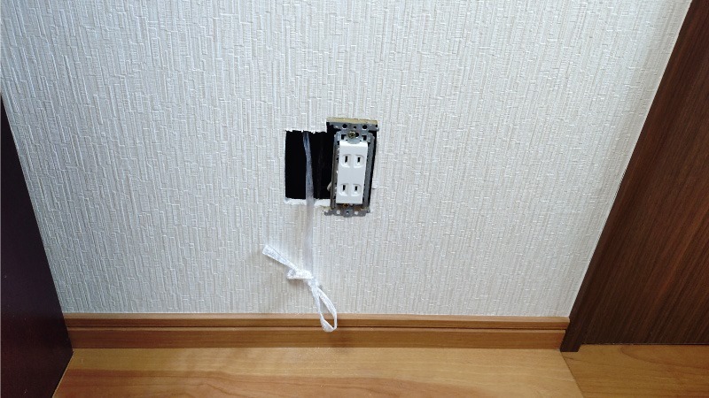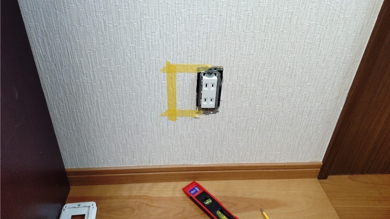 これまでにも何度かご紹介した作業内容ですが、まずは壁に穴を開ける位置にマスキングテープを貼って大きさを確定させます。コンセントが傾いていると穴の位置もズレるため水準器で確認してから作業を開始しました。