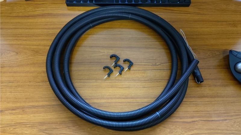 軒下から天井裏まで同軸ケーブルを通すためにこちらの写真の可とう電線管を使います。未来工業のTLフレキという製品で、自宅をリフォームした時にLANケーブルの配線用として購入したものですが、数メートル分余っていましたのでこれを活用します。固定用のステップルもありました。