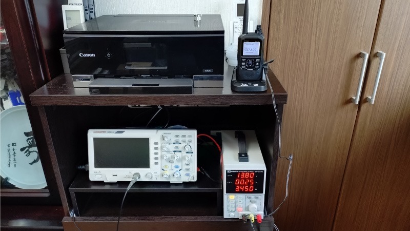 こちらが購入した電源ケーブルを使って直流安定化電源に仮に接続してみた状況です。実際にこの電源を使うかどうかは分かりませんが、とりあえず外部電源を接続してハンディトランシーバーが使えるようになりました。