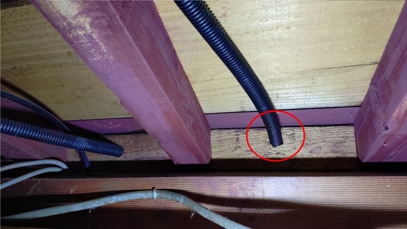 こちらが同軸ケーブルを室内に引き込む軒下になります。昨年、玄関の雨漏れ修理についてご紹介した時にも書きましたが、田舎の古い木造建築ですので軒天と呼ばれる天井は無く、屋根を支えている垂木などがそのまま露出していますので、そこにTLフレキを通す穴を開けてやります。