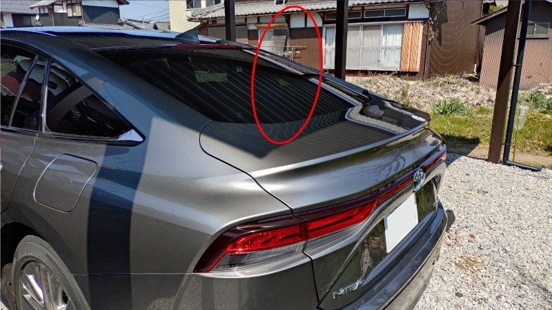 アンテナの設置位置は少しでも高い方が良いためルーフ上がベストなのかも知れませんが、見た目の問題もありますし、同軸ケーブルを車内に引き込む場所も考える必要がありますので、この赤い丸印の付近、トランクの上に固定することにしました。