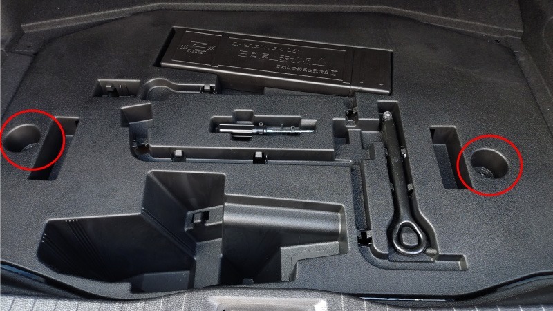 先ほどの写真のカバーを外すとこちらの工具入れが見えます。最近の車は付属品が減っていて牽引フックとドライバーが入っているだけです。三角停止板はオプションでしたので後から買ったものになります。