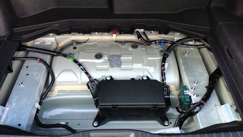 工具入れを外すとこんな感じです。以前の車であればここにスペアタイヤが入っていたかと思いますが、この車にはヒューズやリレーなどが入ったボックスの他、良く分からない電子部品のようなものがいくつか取り付けられていました。