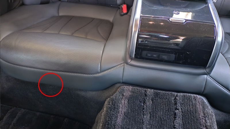 仕方がありませんので、これまでの経験と他車の情報などを参考にして作業を進めます。この座面については赤い丸印のあたりにあるフックで固定されていると思われますので、フロアカーペットと座面との隙間に両手を入れて上に向かって強く引き上げます。
