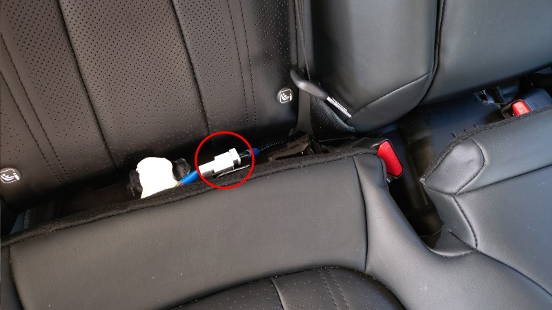 リアシートの背もたれ部分を外す前にこの構造が分かっていたとしても、この状況で同軸ケーブルを座面の下まで通すことは難しいため、やはり背もたれ部分も外す必要があるようです。