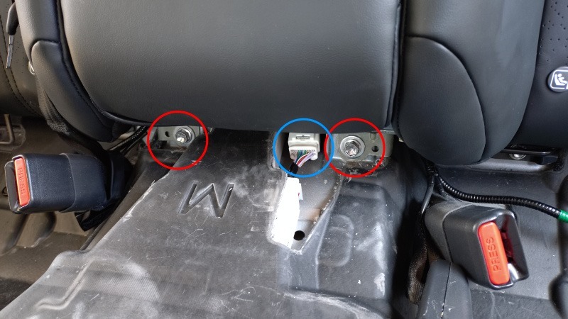座面の後方にあるフックは背もたれ側に差し込んであるだけですので、手前に引けば簡単に外れてきます。尚、シートヒーターや着座センサー用と思われるケーブルが接続されていますので、このコネクタは座面を車外に持ち出す前に抜いておきます。