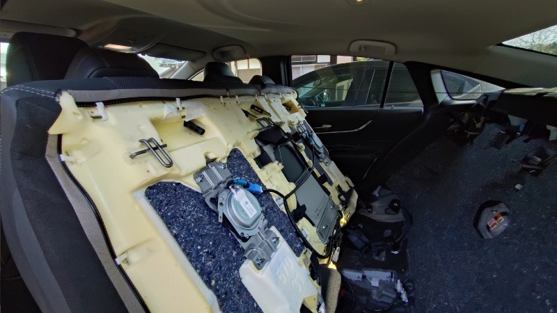 トランクルーム内での作業はこれで終了ですので、後は取り外してあった内装材や工具入れなどを元に戻したら再び車内側の作業に移ります。