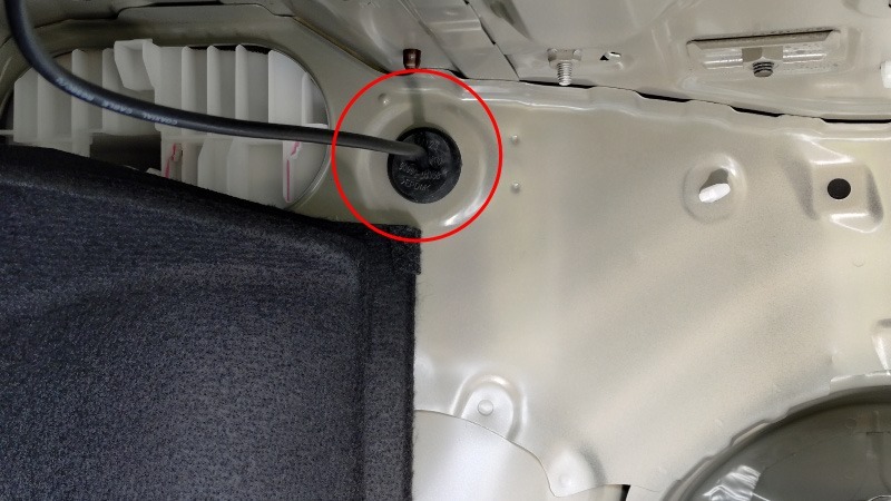 この写真は車内からトランクルーム側を見た状況になります。グロメットを外した穴から向こう側が見えていますので、ここに同軸ケーブルを通す作業は簡単そうな感じです。