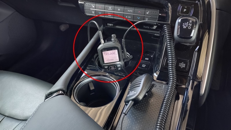最初にも書きましたが、本格的に車載用の無線機を設置する予定は全くありませんので、こちらの写真のようにカップホルダーの中にハンディトランシーバーを置いて使用するつもりです。