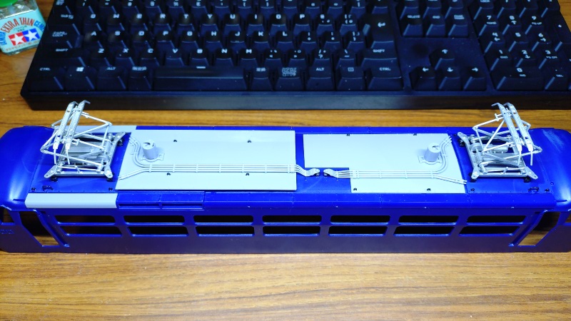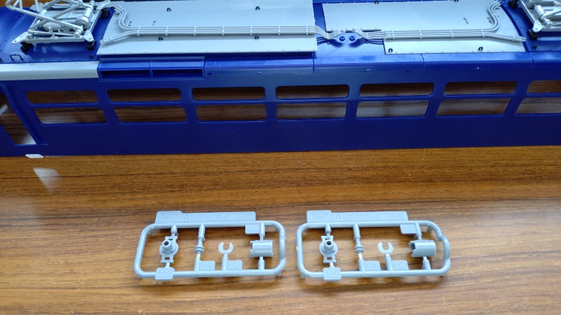 尚、このアオシマの電気機関車は、台車周りだけかなり細かいパーツまで再現されていて、完成後は見えなくなってしまうような部分まで造り込まれているのですが、なぜか非常に良く見える屋根の上については省略されているパーツが多くあり、パンタグラフからの導線が途中からしか無いのが気になりますし、避雷器への配線も表現されていないなど非常に残念な仕様になっており、もう少し何とかならなかったのかと思えてなりません。