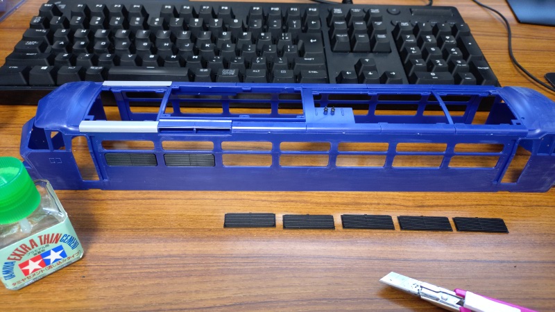 では、側面にあるルーバーを取り付けて行きます。組立説明書の順番に従えばその上部にある窓のパーツも取り付けたいところではあるのですが、ボディの塗装時に透明パーツをマスキングするのは大変ですので、フロントガラスなど運転室周辺の窓も含めて塗装後に取り付けます。