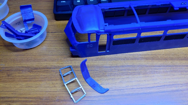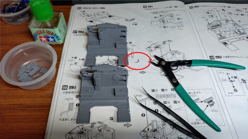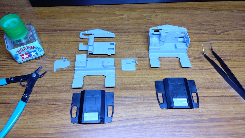 こちらの写真が運転室の主要なパーツになります。この時点ではまだ計器パネルやブレーキなどの操作ハンドル、椅子や消火器といった小物パーツの取り付けが残っていますが、運転室内とは別の色での塗装が必要なパーツもいくつかあるため、それ以外のパーツを順に接着して行きます。