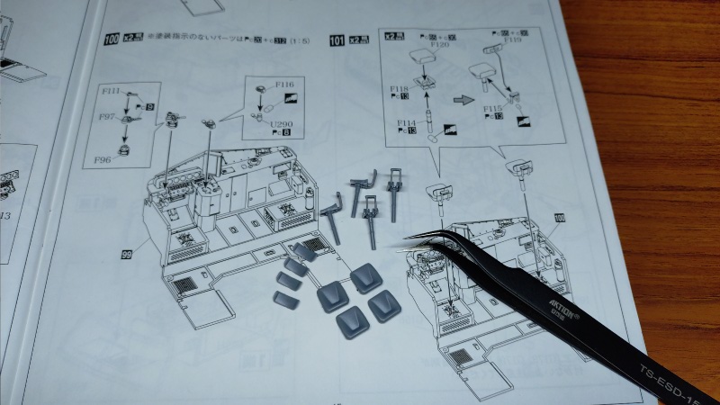 小さ過ぎてピンセットで摘むのも一苦労なのですが、このパーツを運転室のダッシュボードにある穴に取り付けます。この穴のサイズが取り付けようとするパーツよりも微妙に小さいようで、何度か取り付けに失敗している間にピンセットの先から飛んでしまい行方不明になってしまいました。作業を一旦中断し、机の周辺やパソコン、オーディオ機器の下なども探してみたのですが、ライトに照らされて見えるのは小さなゴミや埃ばかりで、30分ほど費やしても見つかりませんでした。