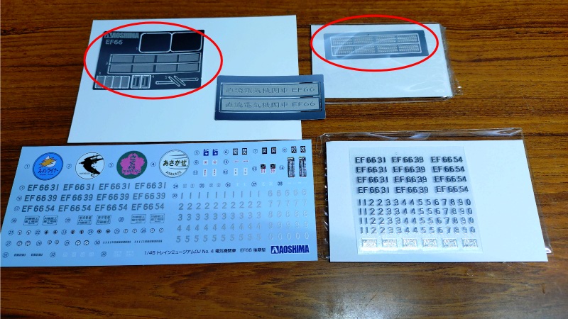 こちらの写真が付属しているエッチングパーツとデカールになります。左側の赤い丸印のエッチングパーツが最初に作られたものだと思いますが、四分割の形状にはなっているもののネットの部分が窪んでいるだけでメッシュ(網目)の表現が何もありません。