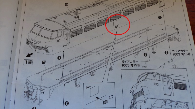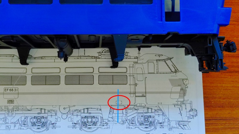 では、両端台車の中央付近にある小さな点検口の取り付け位置を確認します。こちらも組立説明書の中には特に取り付けの指示が見当たりませんので側面図で位置を決めるしかありません。図中の青いラインが台車の中心になるのですが、それよりも少しズレた位置に記載されています。