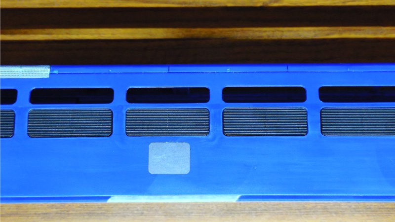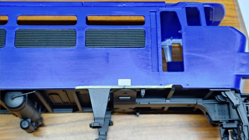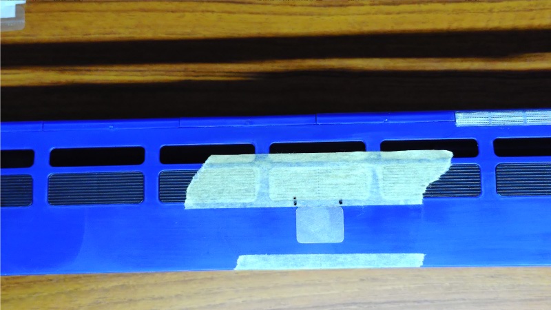 側面図で確認するとこの点検口とボディの下端との距離が0.9ミリ程度でしたので、図面と実際のボディサイズとの比率計算により下端から約1.1ミリの位置にマスキングテープを貼って、そこに合わせる形でエッチングパーツを取り付けました。