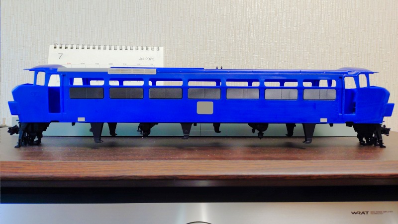こちらの写真がエッチングパーツの取り付けを終えた状況になります。これでボディの塗装作業に進める準備が整いましたので、表面の洗浄処理などを行った後、ボディの前面下部や側面のラインになるクリーム色から塗って行く予定にしています。