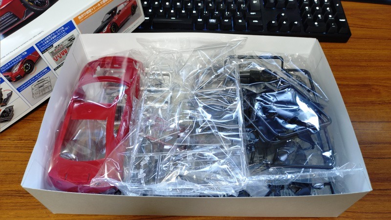 箱の中身を確認してみると、スケールが1/32から1/24になっているためボディのサイズが大きくなっているのと、パーツ数もそれなりに増えている感じで、初めて購入したトヨタ2000GTの時のように箱の中がスカスカということはありませんでした。