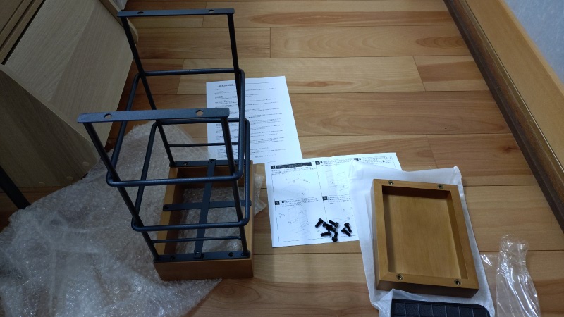 こちらの商品は完成品ではなく簡単な組み立て作業が必要です。スチール製(紛体塗装)の本体に木製のパーツを付属のボルトで固定するだけですので作業時間は10~15分くらいです。