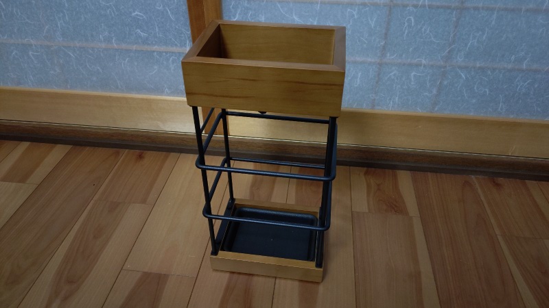 こちらが組み立てを終えた傘立てになります。底面には樹脂製トレイが付いていますし、この写真では木製のパーツに隠れて見えないものの、上部には十字の仕切りが設けてあって傘が1~2本の時でも真っ直ぐに立てられます。