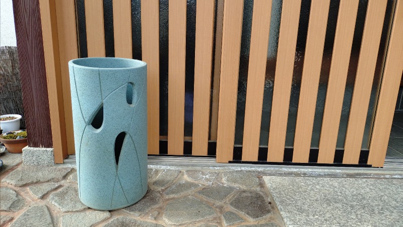 これまでは玄関土間に陶器製の傘立てを置いて使っていたのですが、雨の日の外出後に濡れたままの傘を入れると土間や壁も濡れてしまうため、玄関前にも濡れた傘が入れられる傘立てが欲しいという要望が妻からありました。