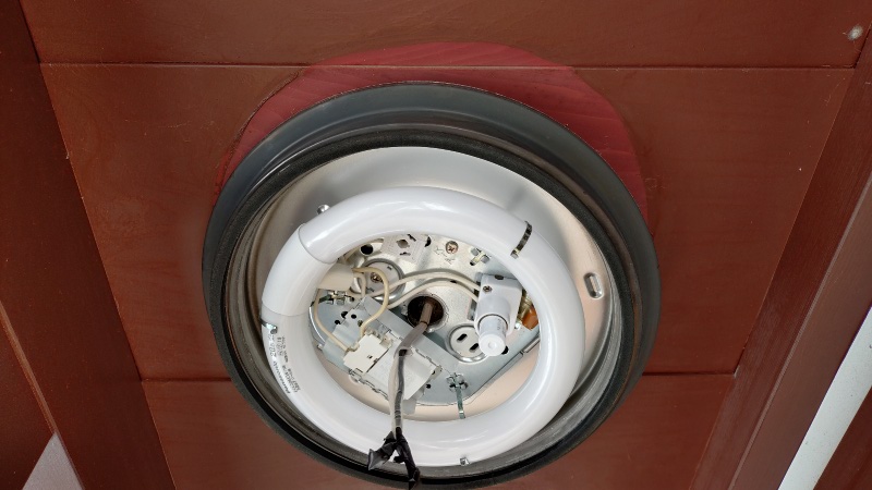 交換前は20形の丸形蛍光ランプでしたので、こちらの器具も20形丸形蛍光灯1灯相当のLEDにしています。消費電力としては22ワットから7.8ワットに減っていますが、使用頻度を考えると省エネ効果は誤差の範囲かと思います。